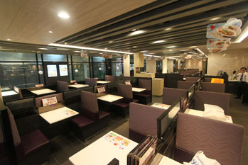 分店的設計簡約舒適,正門時尚彩色的LED招牌,醒目耀眼,給人一種充滿朝氣的形象。店內設置靈活組合的卡位,顧客於用餐時更有私人空間;店面寬敞舒適。最特別的是設置於卡位上的吊燈,吊燈以冰塊樣式設計,使分店設計更顯時尚優雅。舒適的環境、優質的美食,令顧客用餐倍添享受。