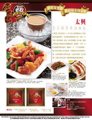 新假期雜誌本年度舉辦的「必吃食店大獎」得獎名單已於5月27日公佈,「太興」榮獲「必吃茶餐廳」及「最回味食府金獎」。能夠獲得業界及顧客的肯定,實在有賴集團一直秉承「優質」出品的宗旨,致力把最高品質的美食帶給廣大顧客。