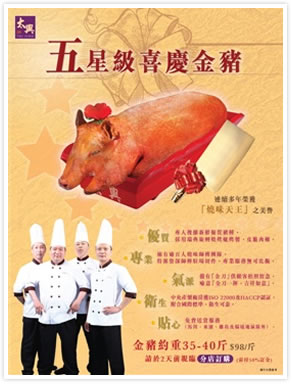 太興「五星級喜慶金豬」不但出品優質,更為顧客提供貼心服務。凡訂購「五星級喜慶金豬」,均可享免費送貨服務,太興更會派出資深燒味師傅穿著整齊制服駐場切件,更備有「金刀」供顧客拍照留念,喻意,「金刀一揮,吉祥如意」,適合新店開幕、聘禮嫁娶、公司派對。 (更多詳情可到各分店查詢)