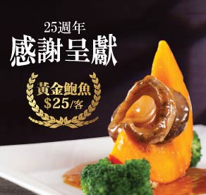 為慶祝集團25週年,太興由即月起逢25日推出$25感謝美食以回饋顧客。2月第一炮黃金鮑魚,由2月25日至3月17日惠顧晚市堂食滿$100或以上,可以感謝價$25享用黃金鮑魚乙客(原價$68/客)。